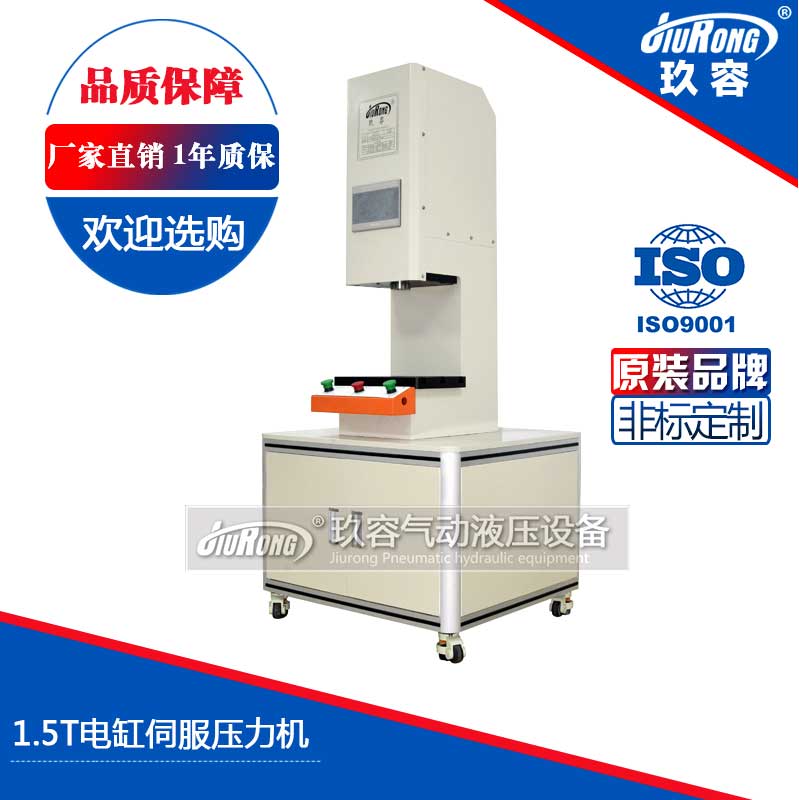 1.5噸伺服壓力機(jī)是半弓型結(jié)構(gòu)的伺服電缸驅(qū)動型壓力機(jī),產(chǎn)品型號為:JRX-100S-150L-1.5T-11KW, 動作產(chǎn)品是1.5噸電缸,150mm總行程,移動速度100mm/s。通過電氣化控制,可以任意編程滑塊的行程、速度、壓力等,甚至在低速動轉(zhuǎn)時也可達(dá)到伺服壓力機(jī)的公稱噸位。
